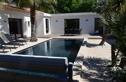 Superb modern and recent villa, of high standing, located between Cavalaire and Croix Valmer, beach on foot, bakery and grocery on foot too, all on a beautiful garden, planted with pines, with protected swimming pool.